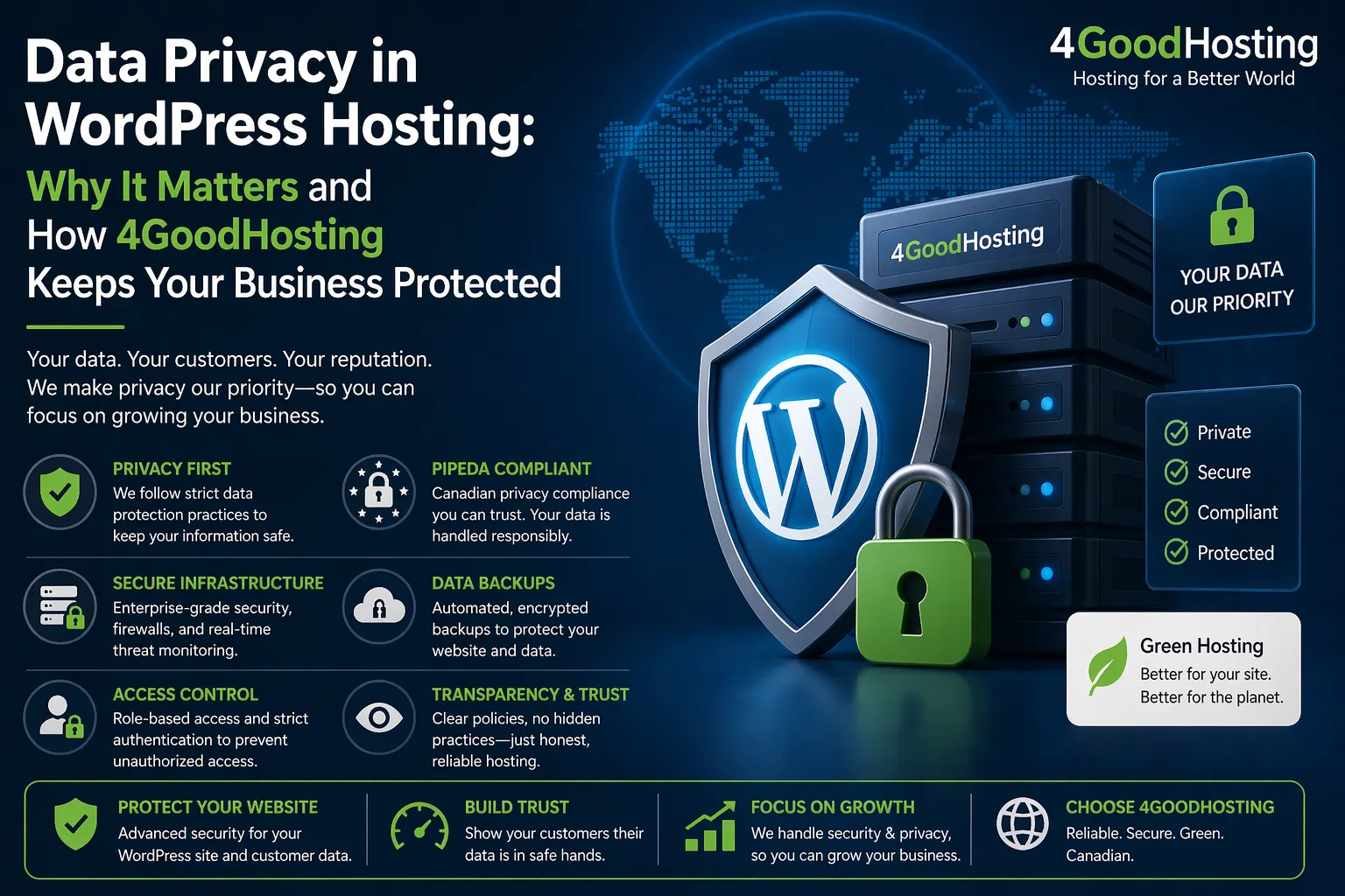 This guide breaks down exactly why data privacy matters at the hosting level, what it means for your WordPress site’s performance and compliance posture, and why 4GoodHosting is the hosting provider that Canadian businesses should trust to get this right.